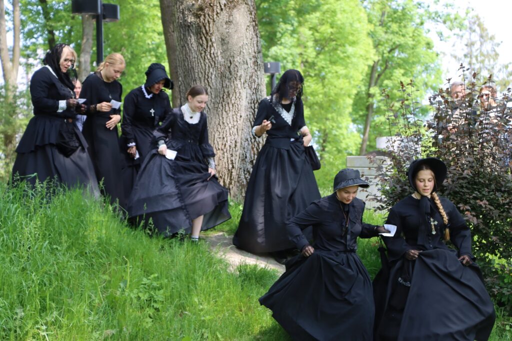 Dziś czarne proste suknie z czarnymi nakryciami głowy i krzyżykami na piersi to znak charakterystyczny rekonstruktorek z Grupy Rekonstrukcji Historycznej Patria. Jak mówi Maria Nogaś: – Przeglądamy stare zdjęcia, analizujemy obrazy, filmy historyczne i na tej podstawie wyszukujemy odpowiednich elementów garderoby, wiele też szyjemy. W ten sposób udaje im się odtworzyć sposób ubioru ludności cywilnej minionych lat.
