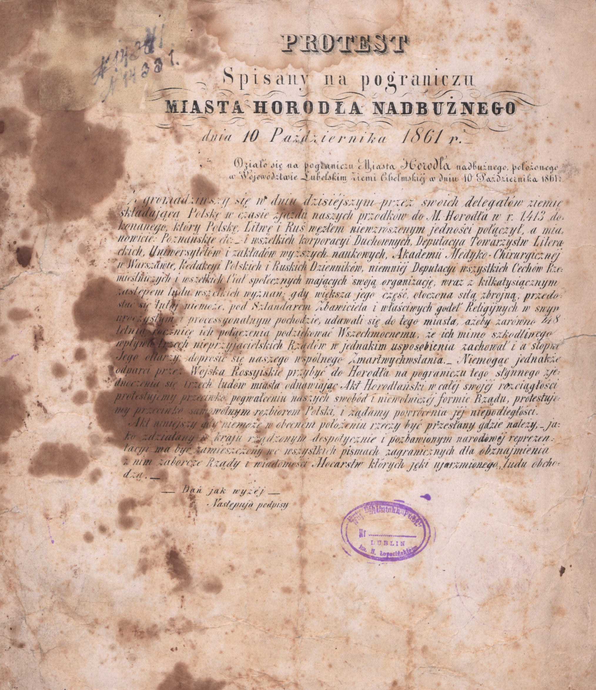 Manifestacja horodelska była jedną z największych, a zarazem ostatnią manifestacją publiczną przed wprowadzeniem stanu wojennego. Obchody miały wiele celów, rozmaicie je też odczytywano. Inicjatorom chodziło o włączenie do ruchu narodowego mieszkańców Rusi, odnowienie i pokazanie braterstwa narodów, które wcześniej przyniosło potęgę państwu polsko-litewskiemu. Umieszczenie Rusi jako równoprawnego elementu trójczłonowej wspólnoty adresowane było tyleż do szlachty ruskiej, w większości odczuwającej jedność z Polską, co do Rosji, roszczącej pretensje do tych ziem. Był to też sygnał dostrzeżenia ruchu ukraińskiego. Akt horodelski z 1861 roku adresowany był również do polskich i spolonizowanych elit, które nadal czuły się jednym narodem politycznym.