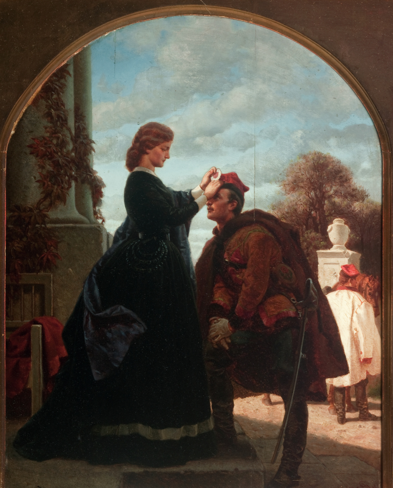 To przewrotne, gorzkie opowiadanie mogło być inspirowane słynnym dyptykiem Artura Grottgera Pożegnanie i Powitanie powstańca. Na pierwszym obrazie ubrana na czarno (ale w jasnej, świetlistej scenerii) żona czule żegna idącego do walki męża, na drugim – po klęsce (i zsyłce) – wita go w półmroku, jest jednak zdystansowana, ubrana w białą, ślubną suknię. Odwraca oczy od powstańca. Zwykło się pisać, że obraz symbolizuje gorycz klęski znoszącą radość z powrotu męża. A może kobieta nie była wierna?