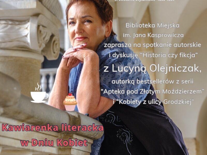 Biblioteka Miejska im. Jana Kasprowicza w Inowrocławiu zaprasza w Dniu Kobiet na spotkanie przy kawie i dyskusję „Historia czy fikcja?” Gościć będziemy Lucynę Olejniczak, autorkę bestsellerów z serii „Apteka pod Złotym Moździerzem” i „Kobiety z ulicy Grodzkiej”. Po Jej książki sięgają chętnie czytelnicy, a zwłaszcza czytelniczki. Lucyna Olejniczak opisuje pasjonujące losy fikcyjnych bohaterów na bogatym tle historycznym. Akcja jej powieści dzieje się m. in. w czasach Powstania Styczniowego.