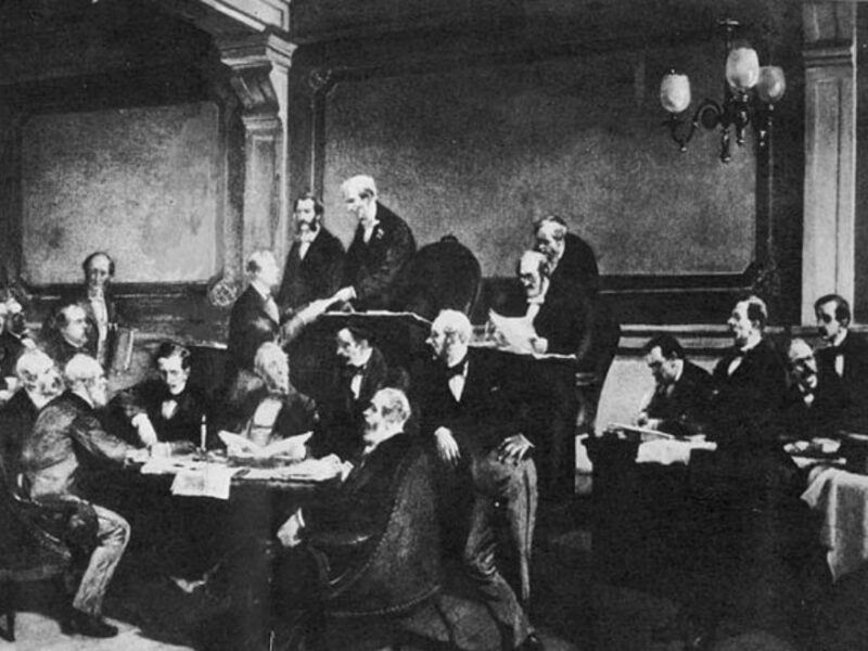 „Tam w głównej recepcji parowca ‘Queen Victoria’, pomiędzy szklankami wina i dymie cygar, 23 mężczyzn w ciepłej atmosferze zgodziło się…