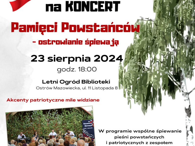 Miejska Biblioteka Publiczna zaprasza dzieci oraz osoby dorosłe na KONCERT "Pamięci Powstańców" - ostrowianie śpiewają, który odbędzie się w piątek 23 sierpnia o godz. 18.00 w ogrodzie Miejskiej Biblioteki Publicznej.