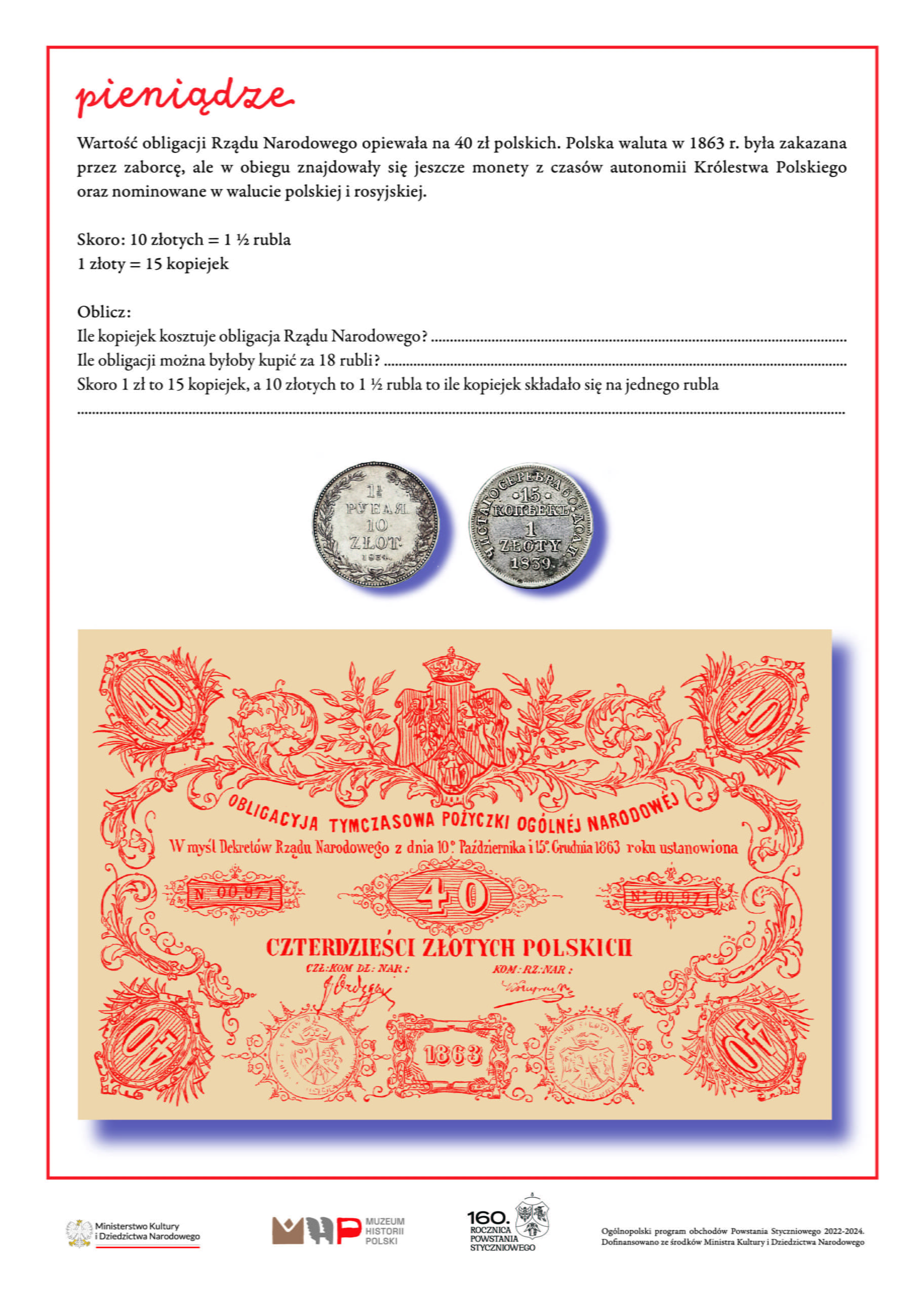 W karcie pracy została przedstawiona wartość polskiej waluty w stosunku do waluty zaborcy.