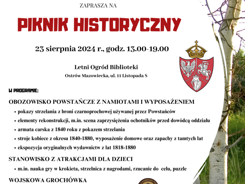 Miejska Biblioteka Publiczna im. Marii Dąbrowskiej w Ostrowi Mazowieckiej zaprasza dzieci oraz osoby dorosłe na PIKNIK HISTORYCZNY w ramach projektu „Pamięci Powstańców”. Piknik odbędzie się w piątek 23 sierpnia w godz. 13.00-19.00 w ogrodzie Miejskiej Biblioteki Publicznej.