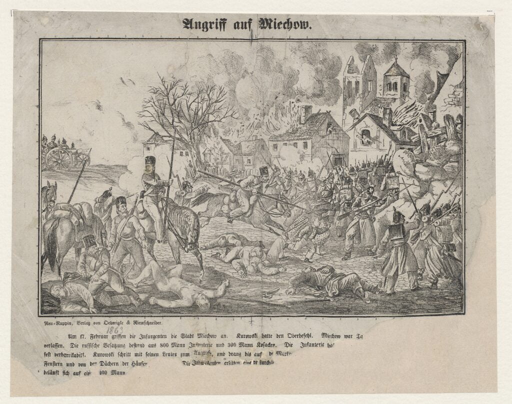 I na chwilę wszystko ucichło. W kwadrans potem wypłynęła nasza kawaleria drugą stroną miasta, złamawszy ustawioną w rynku piechotę, nasiekła sporo mięsa, lecz wyszła z tej brawury zaledwie z połową ludzi, reszta legła od kul i bagnetów moskiewskich. Mięta ranny, resztkami sił zdołał się wydostać z miasta, by zemdlony i ociekający krwią wpaść w długotrwałe omdlenie”.