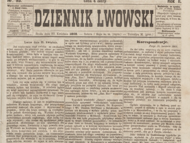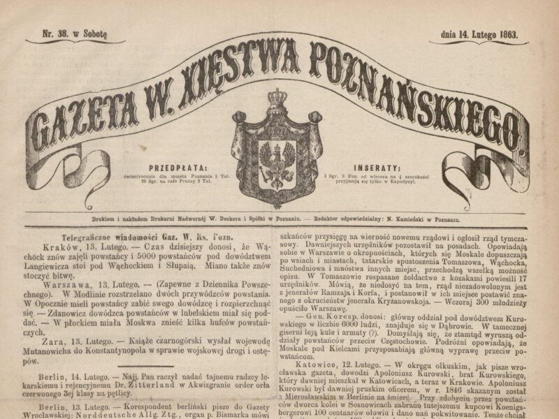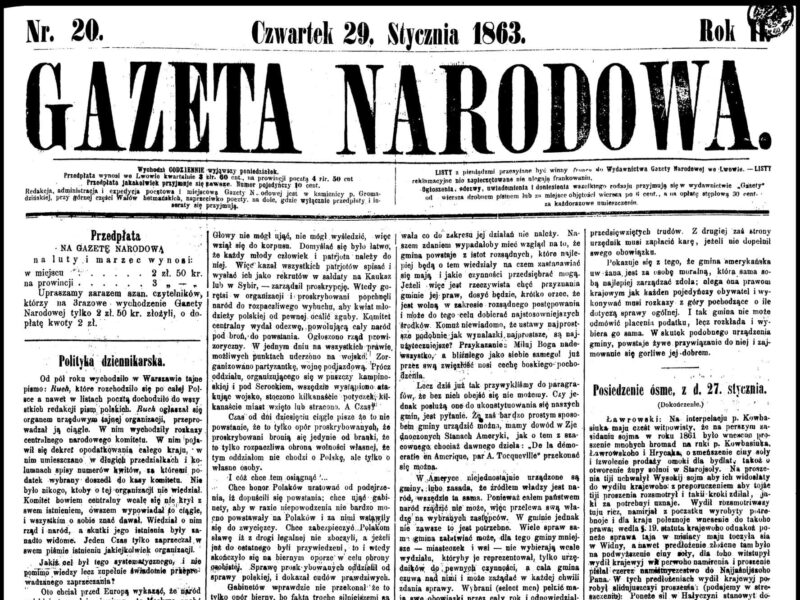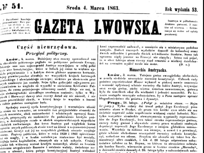 LWÓW, 18. lutego (Sprostowanie pogłoski o zbrojeniu ochotników). Kilka dzienników zagranicznych, a mianowicie pruskich, donoszą o dostarczaniu broni z arsenału lwowskiego dla powstańców polskich, a to dla postawienia Austryi w fałszywem świetle. Ta nierozsądna pogłoska pochodzi ze Lwowa, wylęgła się zaś z płytkiego brania rzeczy bardziej, niż ze złej woli, która ją później obróciła na swoją korzyść.…