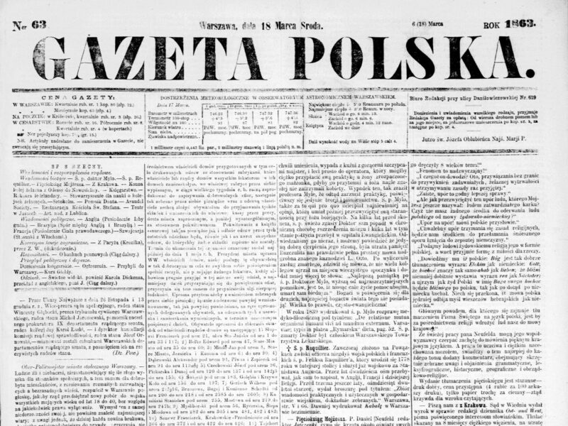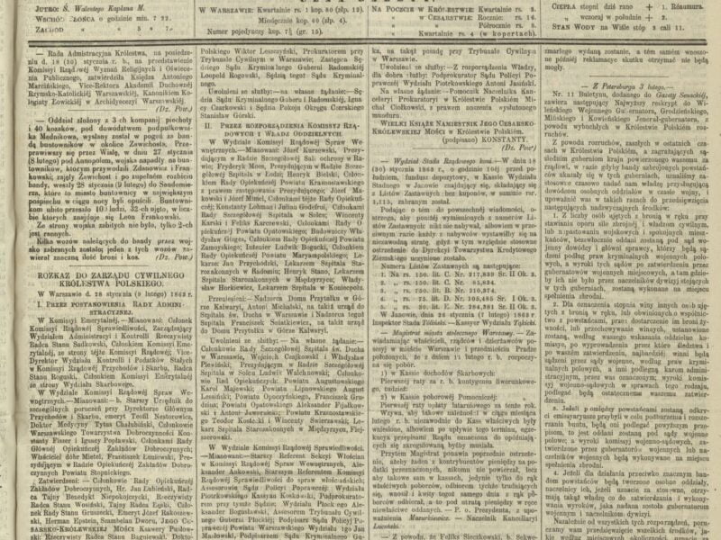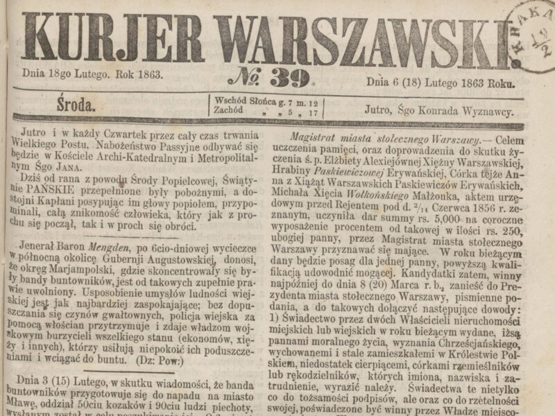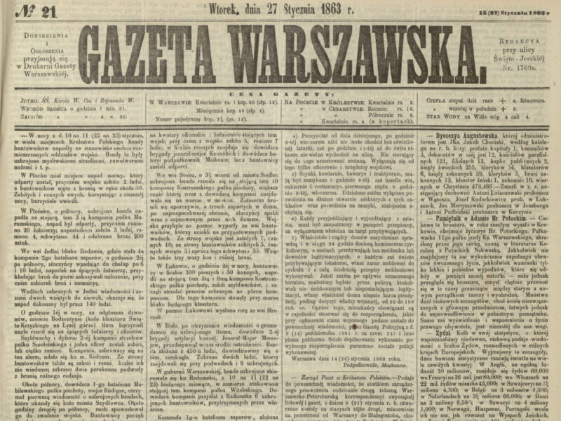 Warszawa, 1. Marca. – Ze źródła rosyjskiego. Wczoraj na Pańskiej ulicy zebrało się około 80 osób, które zabierały się połączyć z powstańcami. Tych jednak policya przydybała. Po kilku strzałach z domu jednego zaczęli uciekać, jednak ich dopędzono i schwytano, przyczem jednego zabito. Nie było potem żadnego zawichrzenia spokojności i panowała zupełna cisza. W Warszawie aresztowano…