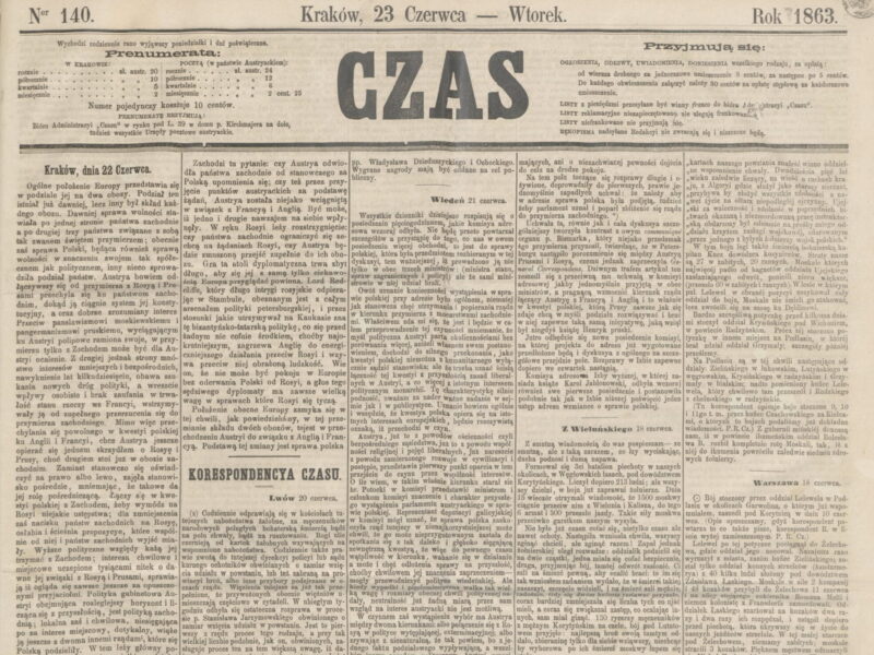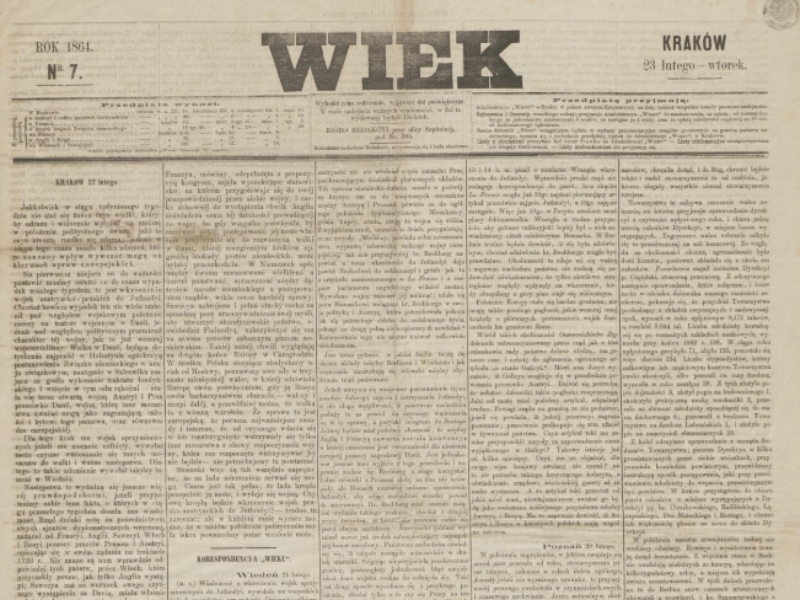 Kraków, 3 kwietnia. Czytamy w „Gazecie Krakowskiej”: „Dziś przeprowadzono Langiewicza z zamku do »lunety Warszawskiej« pod strażą kommissarza i dwóch agentów policyjnych; pociąg pocztowy zatrzymał się w tem miejscu dla odwiezienia b. dyktatora do Brunn. Stamtąd pojedzie on do Tysznowic, gdzie, po daniu uczciwego słowa, że zaniecha wszelkich stosunków z rewolucją, będzie zupełnie swobodnym. Po wyjeździe…