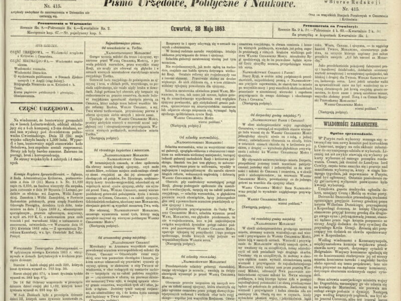 Warszawa, 15 kwietnia. Dziennik Powszechny ogłasza następujący wypis z protokułu sekretaryatu stanu Królestwa Polskiego, który tu powtarzamy jako tekst urzędowy: „Z Bożej łaski, my Aleksander II, cesarz i samowładzca wszech Rosyi, król polski, wielki książę finlandzki, itd. objawiamy wszystkim naszym wiernym i poddanym w Królestwie Polskiem: Na pierwszą wiadomość o wybuchnięciu powstania w Królestwie Polskiem,…