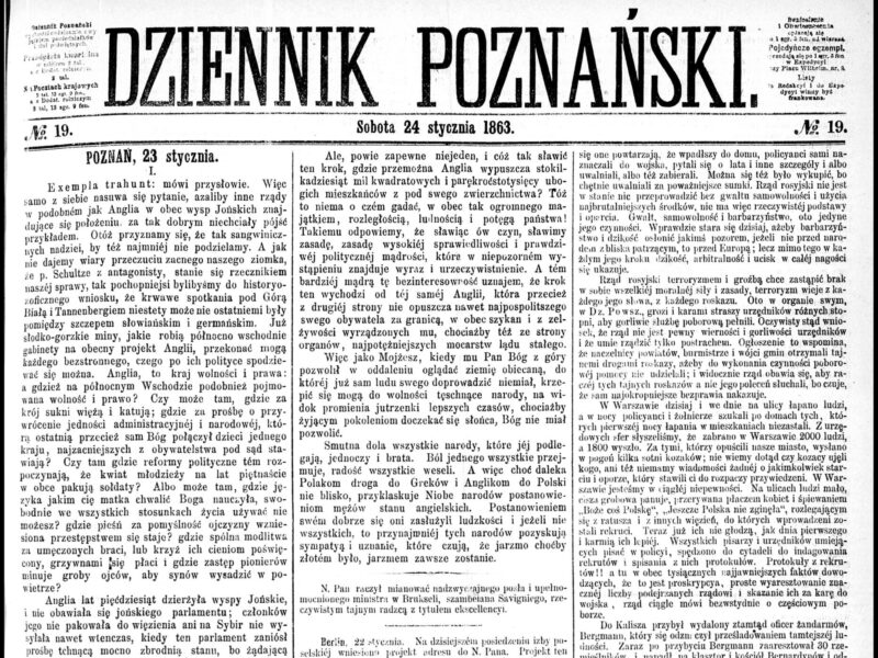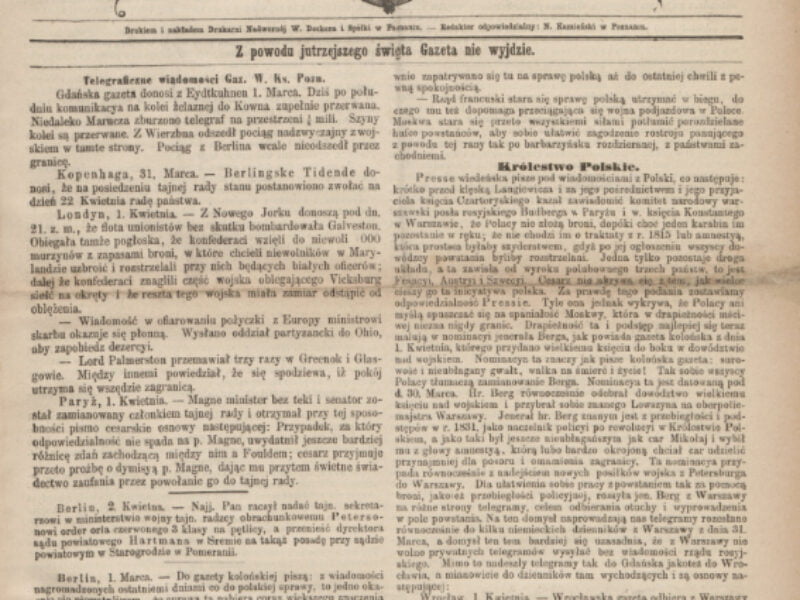 Paryż, 21. Marca – Dzienniki paryskie mało w ogólności podają wiadomości o wypadkach w Polsce. Nie mogą tego pojąć, dlaczego Langiewicz opuścił szeregi polskie w d. 18. b.m., gdy jeszcze wojska jego biły się na d. 19. b.m. Opinion podaje wiadomość z poznańskiego o przejściu wojska rosyjskiego na terytoryum pruskie…