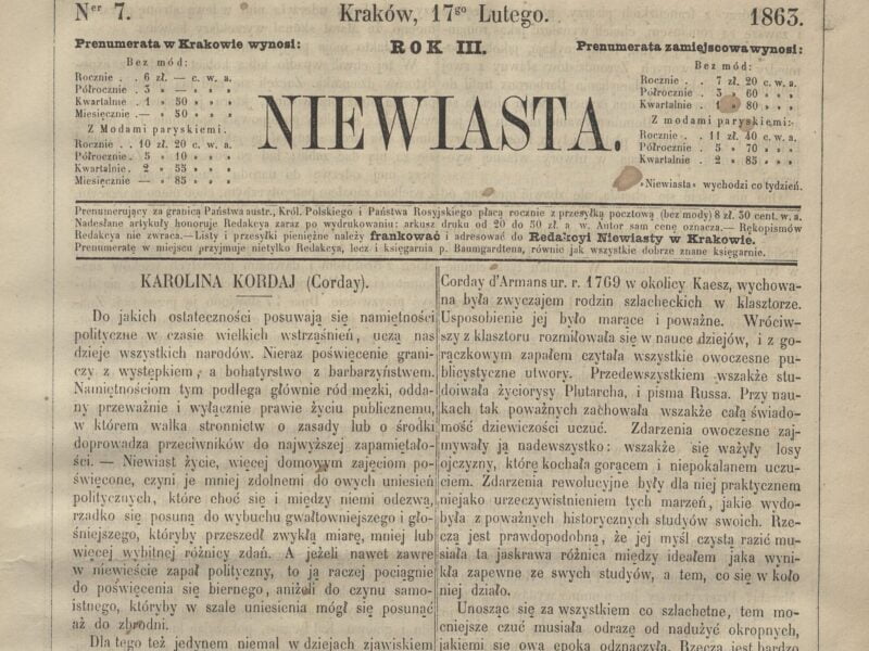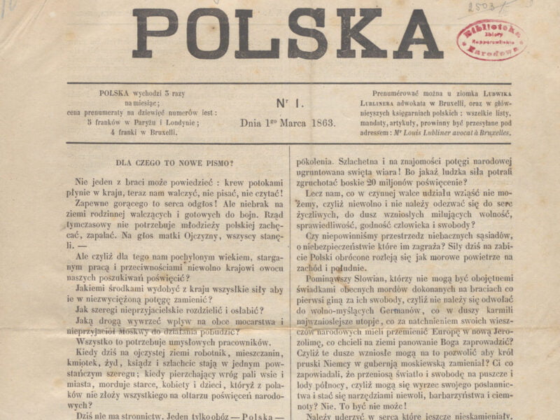 POLSKA wychodzi 5 razy na miesiąc; cena prenumeraty na dziewięć numerów jest: 5 franków w Paryżu i Londynie; 4 franki w Bruxelli Prenumerować można u ziomka Ludwika Lublinera, adwokata w Bruxelli, oraz w główniejszych księgarniach polskich: wszelkie listy, mandaty, artykuły, powinny być przesyłane pod adressem: Mr Louis Lubliner avocata Bruxelles. DLACZEGO TO NOWE PISMO? Niejeden z braci może powiedzieć: krew…