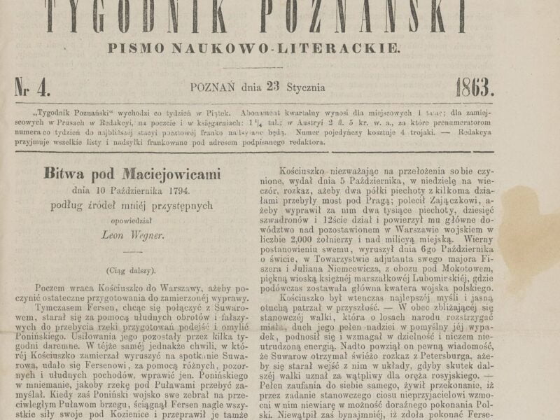 Kraków, 5. Marca. – Dzisiejszy Czas donosi, że wczoraj pod Pieskową Skałą (w Radomskiem, kilka mil na północ zachód od Krakowa) przyszło do bitwy między 800 powstańcami pod Jeziorańskim a Moskalami, którzy na niego w 2000 napadli. Po półtory godzinnej walce cofnął się Jeziorański na bliskie wzgórza zarosłe, gdzie aż do…