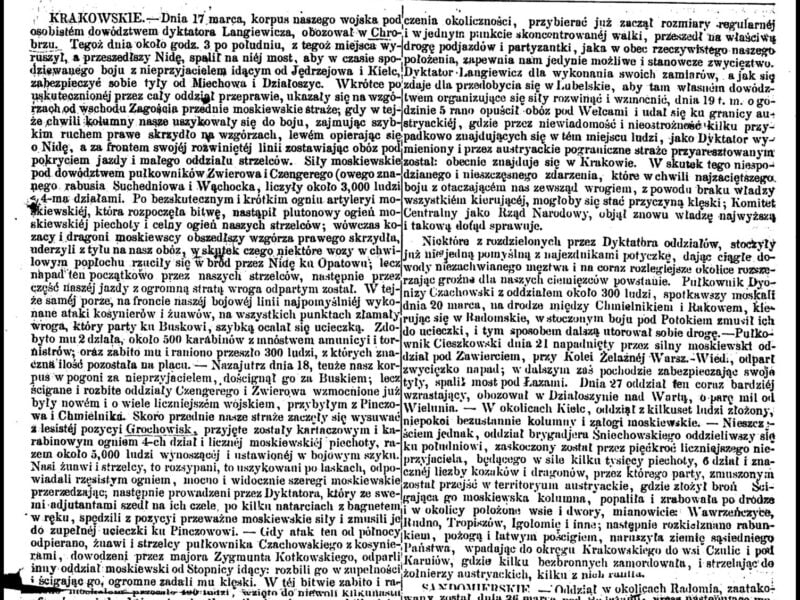 KRAKOWSKIE: – Oddział nasz złożony z dwustu kilkudziesięciu ludzi piechoty i kilkudziesięciu konnych, zupełnie dobrze uzbrojony, pod dowództwem pułkownika Grekowicza; stojąc obozem pod wsią Szklary, przy samej granicy austryackiej, o półtory mili od Olkusza, napadnięty, został dnia 5 b.m., to jest w Wielką Niedzielę, o godz. 8 rano, przez 500 blisko moskali piechoty i kozaków, którzy natychmiast…