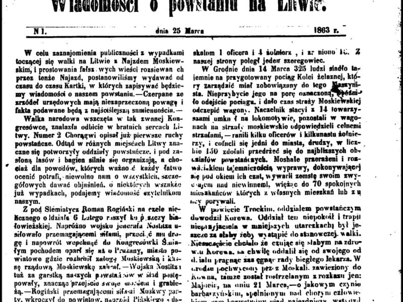 W celu zaznajomienia publiczności z wypadkami toczącej się walki na Litwie z Najazdem Moskiewskim, i prostowania fałszywych wieści rozsiewanych przez tenże Najazd, postanowiliśmy wydawać od czasu do czasu Kartki, w których zapisywać będziemy wiadomości o naszem powstaniu. – Czerpane ze źródeł urzędowych mają niezaprzeczoną powagę i fakta podawane będą z…
