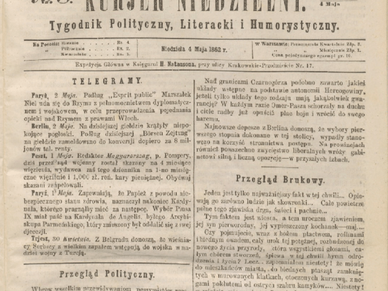 Carogród, 27 marca. Półurzędowy Journal de Constantinople zamieścił onegdaj artykuł pod tytułem „Polska”, noszący na sobie cechę wpływów oficyalnych. Jest to śmiała i godna odpowiedź na przedstawienia sprawującego interesa rosyjskie p. Nowikow, domagające się ścieśnienia protekcyi rządowej dla tutejszych Polaków. Poprzednio już ambasada rosyjska starała się u Porty o nakazanie dziennikom większego umiarkowania…