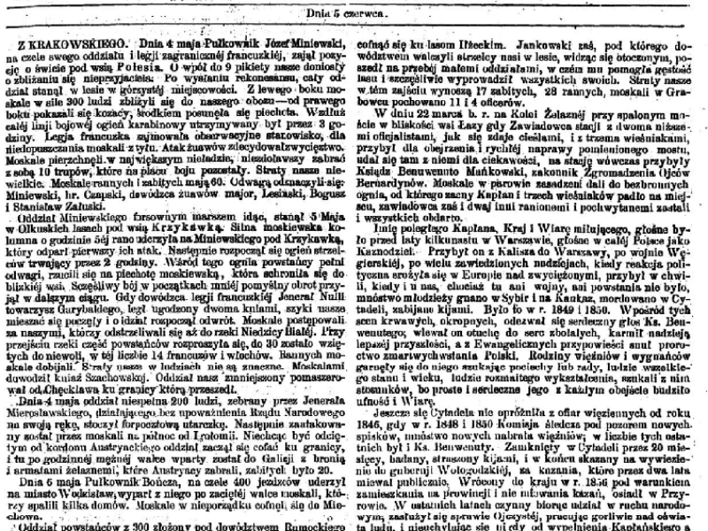 Królestwo Polskie. Znad granicy Król. Polsk. piszą: Faktem jest dokonanym, że Mierosławski znajduje się w Królestwie Polsk. od 17. Lutego, około Radziejowa i wieść się o nim natychmiast po okolicy rozeszła. W pierwszej chwili połączył się z nim oddział konny powstańców, może złożony z 48 koni, do których wkrótce podobny oddział nadszedł. Na tych Moskwa natarła w dniu 11. Lutego…