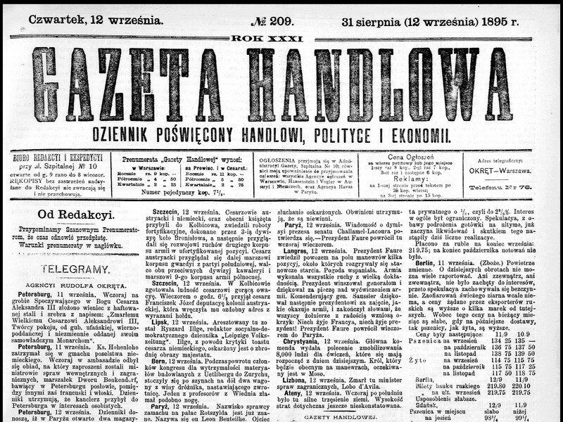 Ziemie polskie. Korespondent „Czasu” donosi, że szpieg pchnięty sztyletem przed pałacem komisji skarbu nie nazywa się Mortko Brandmann, lecz Manas Reingold. Odwieziono go do szpitala starozakonnych, gdzie jeszcze żyje, jakkolwiek jest niebezpiecznie ranny. Rejngold denuncjował trzech ludzi aresztowanych w Garwolinie przez burmistrza, za co miał otrzymać do rządu 200 rs.…