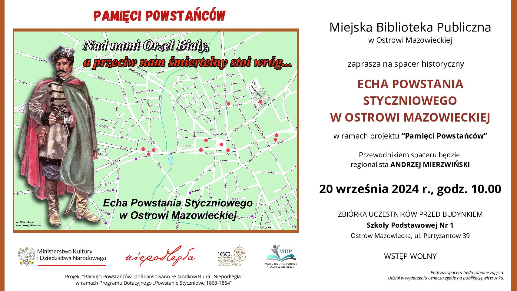 Miejska Biblioteka Publiczna zaprasza młodzież oraz osoby dorosłe 20 września o godz. 10.00 na spacer historyczny ulicami naszego miasta pt. "ECHA POWSTANIA STYCZNIOWEGO W OSTROWI MAZOWIECKIEJ". Przewodnikiem spaceru będzie regionalista ANDRZEJ MIERZWIŃSKI.