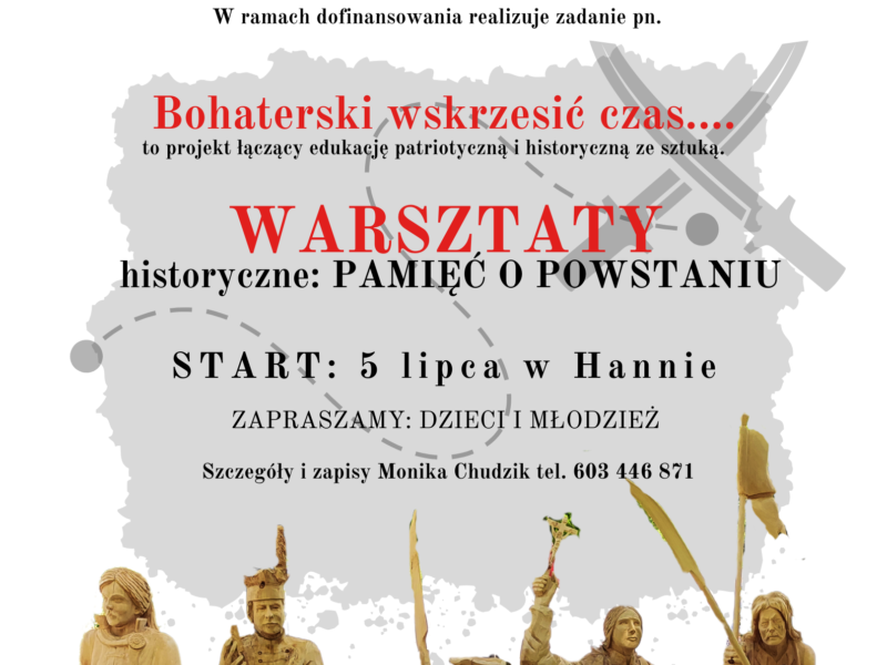 Cykl spotkań jest częścią zadania "Bohaterski wskrzesić czas" realizowanego przez Gminny Ośrodek Kultury i Sporu w Hannie dofinansowano ze środków Biura „Niepodległa” w ramach Programu Dotacyjnego „Powstanie Styczniowe 1863 - 1864”. Uczestnicy warsztatów będą pielęgnować pamięć o bohaterskiej bitwie Powstania Styczniowego - Pod Janówką z 11 lipca 1863 r. Poznawać będą historię Gminy Hanna i najbliższej okolicy, szukając śladów i miejsc pamięci poświęconych Powstańcom Styczniowym. Końcowym rezultatem ma być opracowanie wystawy. Jej odsłonięcie będzie miało miejsce w Centrum Hanny w czasie finału projektu 21 lipca 2024 r.