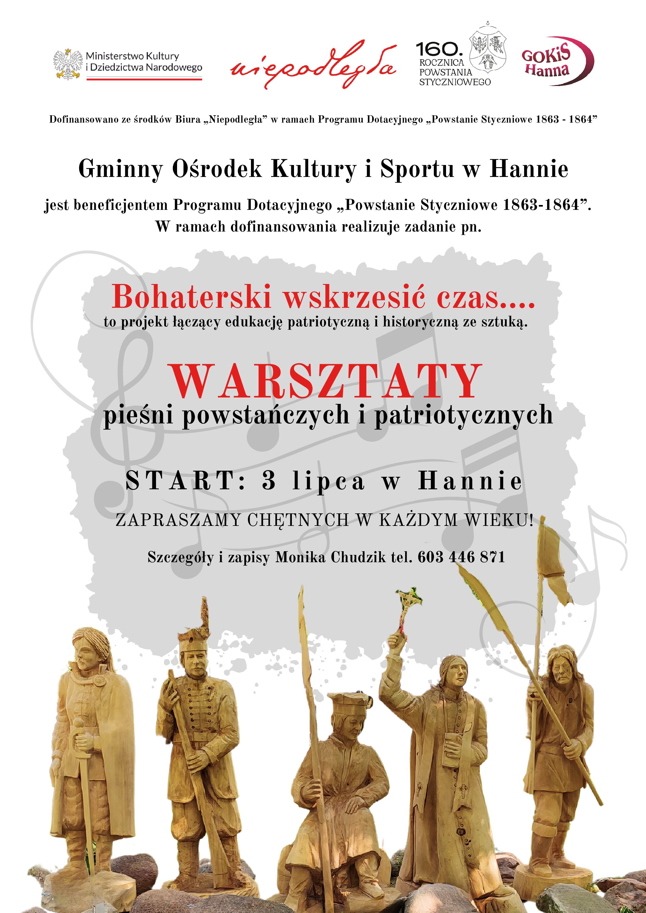 Warsztaty są częścią zadania "Bohaterski wskrzesić czas" realizowanego przez Gminny Ośrodek Kultury i Sporu w Hannie dofinansowano ze środków Biura „Niepodległa” w ramach Programu Dotacyjnego „Powstanie Styczniowe 1863 - 1864” i kończącego uroczyste obchody okrągłej rocznicy wybuchu narodowościowego zrywu. Skierowane są do uczestników w każdym wieku. Zarówno dzieci, jak seniorów. Będzie to nie tylko nauka konkretnych pieśni, ale również ich historii, znaczenia i okoliczności wykonywania. Cykl spotkań pozwoli na konfrontację muzyków - amatorów z profesjonalistami, jak również na odkrycie pieśni powstańczych i patriotycznych w różnorodnych aranżacjach, m.in.: tradycyjnej, ludowej i rockowej. W rezultacie warsztatów powstanie śpiewnik, który będzie służył uczestnikom koncertu finałowego, który będzie miał miejsce w Centrum Hanny 21 lipca 2024 r. Jest to inicjatywa przypominająca, zwłaszcza młodemu pokoleniu o radości wspólnego śpiewu pieśni patriotycznych. Przez długi czas, w naszej polskiej historii, były one przecież zakazane.