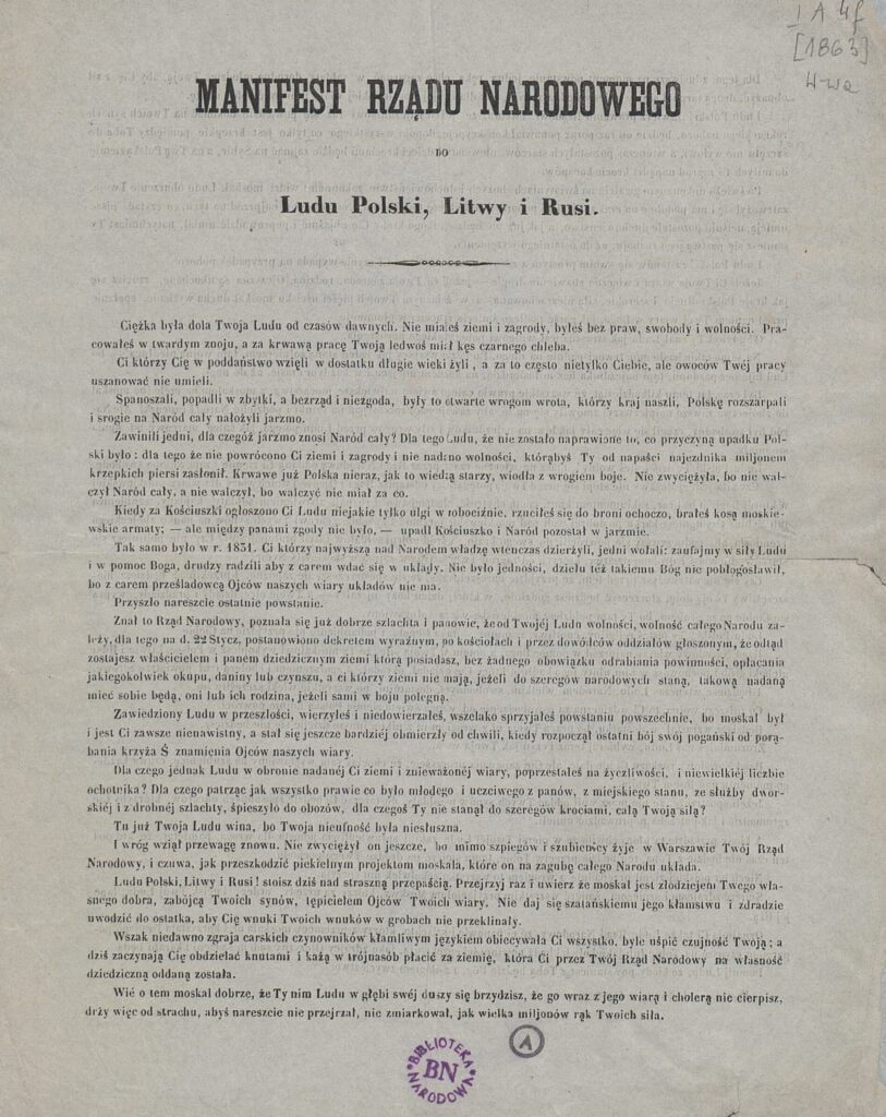 Przede wszystkim uwłaszczenie. Manifest Tymczasowego Rządu Narodowego, wydany 22 stycznia 1863 roku, znosił pańszczyznę i przyznawał chłopom na własność dzierżawioną ziemię, bezrolni zaś mieli ją otrzymać w zamian za udział w powstaniu. Do tego ustanawiał równe prawa dla wszystkich obywateli – ogłaszał „wolnymi i równymi wszystkich synów Polski, bez względu na wiarę, pochodzenie czy stan”. W praktyce znalazło się w nim więc to, na czym chłopom najbardziej zależało.